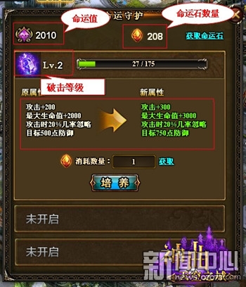 ¡¡¡¡»ñµÃÃüÔËʯ֮ºó£¬Íæ¼Ò¼´¿ÉÔÚÃüÔËÊØ»¤½çÃæ½øÐÐÅàÑø£¬Í¨¹ýÏûºÄÃüÔËʯÀ´ÌáÉý¼¼Äܵȼ¶£¬´Ó¶ø²»¶ÏÌáÉýÍæ¼ÒÆÆ»÷µÈ¼¶ºÍÃüÔËÖµ¡£ÆÆ»÷µÈ¼¶µÄÌá¸ß£¬ÄÜÌá¸ßÍæ¼ÒÔÚÕ½¶·Öеļ¸ÂÊ´¥·¢µÄЧ¹û£¬Í¬Ê±ÌáÉýÍæ¼Ò²¿·ÖÊôÐÔ¡£ÃüÔËÖµÔò¿ÉÒÔÌåÏÖÃüÔËÊØ»¤ÏµÍ³´ø¸øÍæ¼ÒÊÕÒæµÄÕûÌåˮƽ¡£