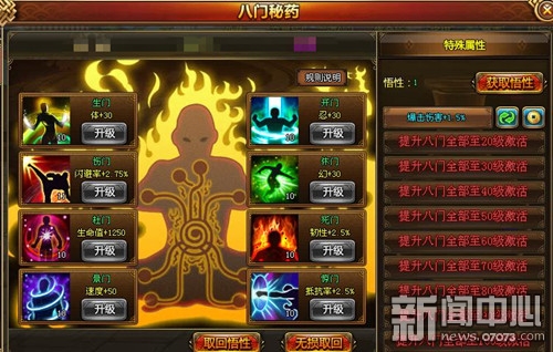 ¡¡¡¡Íæ¼ÒÔÚÍê³É52¼¶µÄÖ÷ÏßÈÎÎñÖ®ºó¼´¿É¿ª·Å°ËÃÅÃØÒ©ÏµÍ³£¬Í¨¹ýÏûºÄ×Ô¼ºÔÚÍ⴫ϵͳÖеõ½µÄÎòÐÔµã¶ø¿ªÆô×Ô¼ºµÄ°ËÃÅÊôÐÔ¡£ÔÚÓÎÏ·ÖУ¬°ËÃÅ·Ö±ð´ú±íÁË8ÖÖ²»Í¬µÄÊôÐÔ¡£·Ö±ð·ÖΪÉúÃÅ£¬ÉËÃÅ£¬¶ÅÃÅ£¬¾°ÃÅ£¬¿ªÃÅ£¬ÐÝÃÅ£¬ËÀÃÅ£¬¾ªÃÅ£¬ÓÃÎòÐÔµã³öһÞÍÄܹ»ÌáÉýÄÇÒ»ÃÅËù¶ÔÓ¦µÄÊôÐÔÖµ£¬Ã¿Ò»ÃÅÊôÐÔ¶¼Äܹ»×î¸ßµãÂú100¼¶¡£´òͨ°ËÃÅ£¬¿ØÖƲé¿ËÀ£¬Ò»ÇоͱäµÃÕâô¼òµ¥¡£
