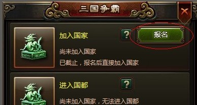¡¡¡¡Ò»¡¢±¨Ãû¼ÓÈë¹ú¼Ò£º¸÷°ïÅɵÄÕý°ïÖ÷£¬¿É“Èý¹úÕù°Ô”½çÃæ£¬Ñ¡Ôñ“±¨Ãû”¼ÓÈëκÊñÎâÈÎÒâÒ»¸ö¹ú¼Ò¡£
