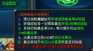 ¡¡¡¡»ñµÃ×°±¸Ö®ºó£¬µ±È»¾ÍÒªÉý¼¶ÁË¡£³èÎï×°±¸ÕâÀïÉý¼¶ÒªÏûºÄµÄµÀ¾ßÊÇħËè×꣬ÿ´ÎÏûºÄ¶¼¿ÉÒÔ»ñµÃµÈ¼¶¾Ñ飬¶øÇÒ»¹¿ÉÄÜËæ»ú´¥·¢±©»÷£¬»ñµÃ3±¶µÈ¼¶¾Ñé¡£¹ØÓÚ±©»÷µÄ»ñÈ¡£¬Ã¿´ÎÉý¼¶²Ù×÷¶¼»áÔö¼Ó10%µÄ±©»÷ÂÊ£¬Ò²¾ÍÊÇ˵¾ÍËãºÜµ¹Ã¹Óö²»µ½±©»÷£¬µãÂú10´ÎÒ²±Ø¶¨¿ÉÒÔ±¬Ò»»Ø£¬¼ÇסÍíÉÏ0µãʱºò±©»÷ÂÊ»áÇåÁãŶ~