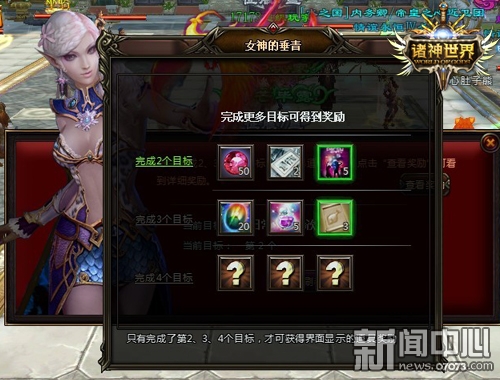 ¡¡¡¡ÓÎÏ·Àï£¬Íæ¼Òÿ´ïµ½Ò»¸öÅ®Éñ´¹ÇàµÄÄ¿±ê£¬¼´¿É»ñµÃ²¿·Ö½±Àø¡£ÆäÖУ¬Ö»ÓÐÍê³ÉÉÏһĿ±ê£¬·½ÄÜ¿´µ½ÏÂһĿ±êµÄ½±Àø¡£Ëæ×ÅÄ¿±êµÄÌáÉý£¬ÆäÖеĽ±ÀøÒ²»áÔ½·¢·áºñ¡£ÕâЩÈÎÎñÄÒÀ¨ÁËÓÎÏ·ÀïµÄ´ó²¿·Ö¾µäÈÎÎñ£¬ÓÐÒ×ÓÐÄÑ£¬È«Æ¾ÔËÆø¡£ÄãµÄÐÒÔËÅ®ÉñÒѾµ½À´£¬»¹²»ºÃºÃ°ÑÎÕ£¬×¥½ô»ú»á£¡