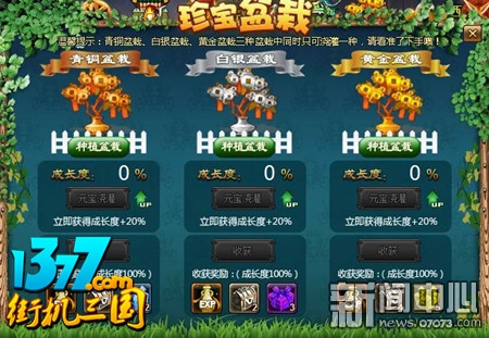 成为土豪之后,自然是要提升自身的修养与内涵了,盆栽就是不二的选择。玩家达到一定级别之后即可进入珍宝盆栽界面,种植盆栽可以为玩家带来不菲的收益。玩家可花费元宝种植盆栽,盆栽每日自动获得10%成长度。当成长度为100%时,玩家可根据种植盆栽的品质获得相应奖励。需要注意的是,青铜盆栽、白银盆栽、黄金盆栽三种盆栽中同时只可浇灌一种,请看准了下手哟。