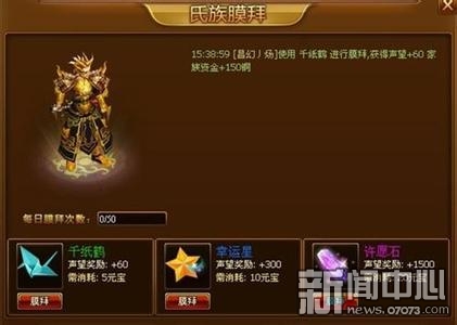 ¡¡¡¡·Ö±ðʹÓõÀ¾ß¡¾Ç§Ö½º×¡¿¡¢¡¾ÐÒÔËÐÇ¡¿¡¢¡¾ÐíԸʯ¡¿µÀ¾ß¶ÔÉñÏñĤ°Ý£¬¿ÉÔö¼Ó¼Ò×å×ʽðºÍ¸öÈËÉùÍû£¬Ã¿ÖÖĤ°Ý·½Ê½½±ÀøµÄ²»Í¬£¬¸öÈ˵ȼ¶Ô½¸ß»ñµÃµÄÉùÍûÔ½¸ß¡£