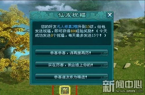 ¡¡¡¡×£¸£ÏµÍ³ÊÇ3737¡¶·²ÈËÐÞÕæ2¡·ÖÐÒ»¸öºÃÓÑ»¥¶¯µÄ¸£Àûϵͳ£¬ÔÚÓÎÏ·ÖÐÍæ¼Ò½«ÆäËûµÄºÃÓѼÓΪºÃÓÑ£¬¶øÖ»ÒªºÃÓÑË«·½ÈκÎÒ»·½µÄµÈ¼¶Éý¼¶µ½15¼¶ºó¾Í¿É¿ªÆôºÃÓÑËÍ×£¸£Íæ·¨£¬ºÃÓÑÃÇÿÉý¼¶5¼¶¾Í»áÊÕµ½ÏµÍ³·¢À´µÄ“ºØ”ËÍ×£¸£Ìáʾ£¬¾ñÔñ¸÷ÖÖ×£¸£ÓËÍÉÏÄã×îÕæ³ÏµÄ×£¸££¬Ã¿Ìì×î¶à·¢ËÍ15¸ö×£¸££¬¶ø×£¸£³É¹¦ºóË«·½¾ù¿É»ñµÃ·áºñ¾Ñé½±ÀøµÄŶ¡£