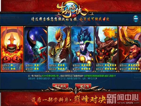 ¡¡¡¡4399¹Å½£ÆæÏÀµÄÍæ¼ÒÿÌìÓÐ4´ÎÌôÕ½´ÎÊý£¬¿ÉÔÚÁù¸öÌì±ø¸óbossÈÎÒâÑ¡ÔñÒ»¸öboss½øÐÐÕÙ»½£¬Ò²¿Éͨ¹ýÒ»¼üÕÙ»½Ö±½ÓÏûºÄµ±Ç°ËùÓдÎÊýÕÙ»½×îºóËĸöÌì±ø¸óboss£¬boss°´ÓÉÈõÖÁǿ˳Ðò´Ó×óµ½ÓÒÅÅÁС£