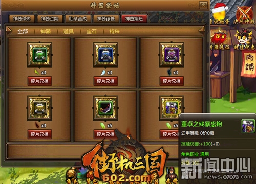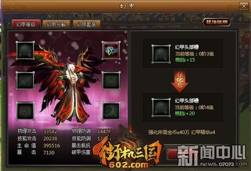 得到幻甲装备之后,要如何进一步提高装备的实力呢?那当然不容错过的一步就是强化了。幻甲装备的强化,能够提高各装备的对应属性加成。当对应装备位置的等级突破一个阶段的时候,每一级增加的属性会增多。上面提到的幻甲精华,为什么要将初级碎片换成董卓装备部件分解成为幻甲精华呢?那就是为强化做准备的,1幻甲精华可是相当于10元宝噢。所以各位玩家在前面选择的时候就可以根据自身的情况来选择。602《街机三国》玩家QQ群:325085061