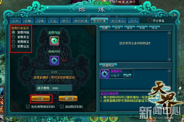 ¡¡¡¡ÕâÀïÌṩ¸ø´ó¼ÒÒ»¸öÊÕ¼¯²ÄÁÏСÇÏÃÅ£¬ÔÚ¡¶Ìì½ç¡·ÖУ¬´ó¼Ò»¹¿ÉÒÔ·´ÆäµÀ¶øÐÐÖ®£¬½«ÔÓеģ¬Ã»ÓÐÓõı¦Ê¯½øÐвð½â£¬·Ö³ö¸ü¶à±¦Ê¯Ë鯬£¬ÔÙ½«ÆäºÏ³Éеı¦Ê¯¡£¾Ù¸ö¼òµ¥µÄÀý×Ó£¬Íæ¼ÒÈôÊǶÔ3¼¶ÖÁ6¼¶µÄ±¦Ê¯½øÐвð½â£¬±ã¿É´Ó×ÏϼÂêè§¡¢×ÏϼÁ¼Óñ¡¢×Ïϼ¾«Óñ¡¢×ÏϼÏÉÓñ”ÈÎÒâÒ»¸ö¡£µ½Ê±ºò£¬ÔÙÅäÉÏÆäËû±¦Ê¯²ÄÁÏÈںϣ¬´ó¼Ò¾Í¿ÉÒÔÇáËÉ»ñµÃȫеĸ´ºÏ±¦Ê¯ÁË¡£