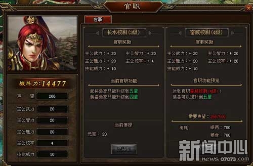 ¡¡¡¡Í¬Ê±£¬¹ÙÖ°µÄ¸ßµÍÒ²¾ö¶¨ÁËÎ佫»¹ÓÐ×°±¸Éý¼¶µÄÏÞÖÆ£¬¹ÙÖ°Ô½¸ß£¬¿ÉÉý¼¶Ò²¾ÍÔ½¸ßÁË¡£ÏëÊÕ»ñ¸üÇ¿Î佫ºÍ×°±¸£¬¼ÇµÃÒªÌáÉý×Ô¼ºµÄ¹ÙְŶ¡£³ýÁËÉÙÁ¿µÄÒøÁ½ºÍÁ¸Ê³Í⣬Éý¹Ù×îÖ÷ÒªµÄÊÇÉùÍû£¬Íæ¼ÒÿÌì²Î¼ÓÈÕÐÐÒ»ÉÆ¾Í¿ÉÒÔ»ñµÃÉùÍûÁË¡£Èç¹ûÏ뾡¿ìÉý¹Ù£¬»¹¿ÉÒÔÏûºÄÉÙÁ¿µÄÔª±¦»ñµÃ±¦¹óµÄÉùÍû¡£