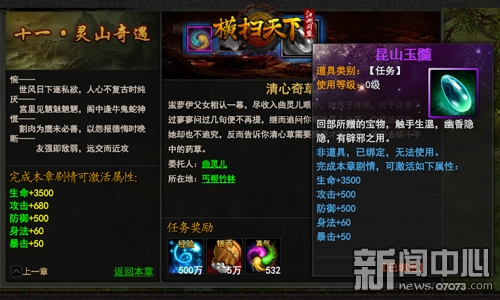 ¡¡¡¡µ±ÄúÍê³ÉµÚʮһÕÂÖ÷Ïß¾çÇéÈÎÎñºó£¬»áµÃµ½°ó¶¨½±Àø——»Ø²¿±¦Îï“À¥É½ÓñË蔡£¾Ý´«£¬´ËÎï´¥ÊÖÉúΣ¬ÓÄÏãÒþÒþ£¬ÓбÙа֮Ó᣻ñµÃ¿É¼¤»îÊôÐÔ£ºÉúÃü+3500¡¢¹¥»÷+500¡¢·ÀÓù+500¡¢Éí·¨+60¡¢±©»÷+50£¬³ý´ËÎïÍ⣬»¹ÓÐÖ÷ÏßÈÎÎñµÄÊôÐÔ¼Ó³ÉŶ£¡