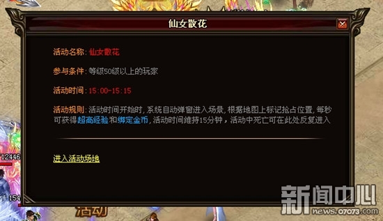 ¡¡¡¡Ã¿ÌìÏÂÎç15:00—15:15·Ö£¬6637¡¶ÖðÈÕÕ½Éñ¡·µÈ¼¶50ÒÔÉϵͼ¿ÉÒÔͨ¹ýµã»÷ϵͳ·¢¹ýÀ´µÄ»î¶¯µ¯´°£¬Ö±½Ó´«Ëͽø“ÏÉŮɢ»¨”¸±±¾£¬»ñµÃÏÉÅ®µÄ×£¸££¬µÃµ½´óÁ¿µÄ¾Ñé¡£ÁíÍ⣬ÎÒÃÇÒ²¿ÉÒÔÔÚÍÁ³ÇÕÒ¸±±¾NPCµã»÷½øÈ¥¡£