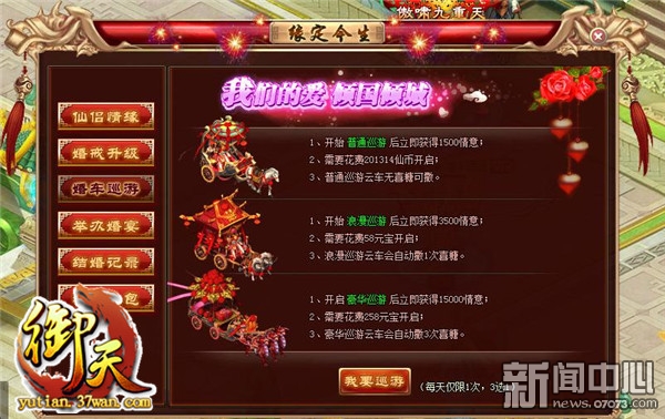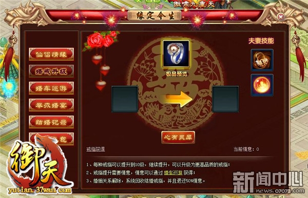 ¡¡¡¡µ±Íæ¼ÒµÄ½ÇÉ«ÈËÎï´ïµ½35¼¶ºó£¬¾Í¿ÉÒÔ¿ªÆô37wan¡¶ÓùÌì¡·ÏÉÂÂÇéԵϵͳ£¬µã»÷¿É´ò¿ªÏÉÂÂÇéÔµ½çÃæ¡£ÔÚ½çÃæÖпÉÒÔ¿´µ½ÏÉÂÂÇéÔµ¡¢»é½äÉý¼¶¡¢»é³µÑ²ÓΡ¢¾Ù°ì»éÑç¡¢½á»é¼Ç¼Ó볬ֵÀñ°üÕâÁù´ó¹¦ÄÜ¡£