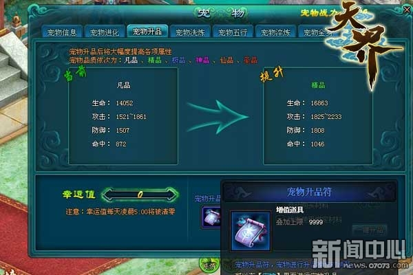 ¡¡¡¡¡¶Ìì½ç¡·ÖУ¬³èÎﻹ¿ÉÒÔͨ¹ý½ø½×¡¢Éý¼¶µÈ·½Ê½À´ÌáÉý×Ô¼ºµÄÆ·ÖÊ£¬Ìá¸ßÕ½¶·Á¦¡£Ä¿Ç°£¬³èÎï°´Æ·ÖÊ·ÖΪ·²Æ·¡¢¾«Æ·¡¢¼«Æ·¡¢ÉñÆ·¡¢ÏÉÆ·£¬³èÎïÆ·ÖÊÔ½¸ß£¬Æä¸÷ÏîÊôÐÔÒ²»áÔ½¸ß¡£Í¬Ê±£¬Æä³öսʱ´ø¸øÖ÷È˸½¼ÓµÄÊôÐԾͻáÔ½¸ß¡£¶ø³èÎïÆ·ÖʵÄÌáÉý£¬×î¹Ø¼üµÄµØ·½¾ÍÔÚÓÚ“Á·¹Ç·û”µÀ¾ßµÄ»ýÀÛ£¬Ö»Òª´ËµÀ¾ß¹»¶à£¬¿ìËÙÉýÆ·¾Í¾ø¶Ô²»ÊÇÎÊÌâÁË¡£