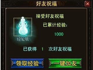 ¡¡¡¡ÀÏÓÑÁ½±ßµ½´ï25¼¶ºó£¬¶Ô·½½ú¼¶£¬ÇÒÍæ¼ÒÔÚÏߣ¬Íæ¼Ò»áÊÕµ½×£Ô¸Ìáʾ£¬×£Ô¸ÀÏÓѺó£¬Íæ¼ÒºÍÀÏÓѶ¼»áÈ¡µÃ¾Àú½±ÉÍ£¬ÀÏÓѵȼ¶Ô½¸ß£¬×£Ô¸È¡µÃ½±ÉÍÔ½¶à¡£