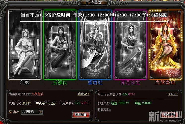 ¡¡¡¡Íæ¼ÒÔÚ´ïµ½30¼¶ÒÔºó±ã¿É½øÐл¤ËÍÈÎÎñ£¬Ã¿Ìì¶¼¿ÉÒÔÓÐÈýÌË»¤ËÍÃÀÅ®µÄ»ú»á£¬VIP»¹ÄܶîÍâÔö¼ÓÒ»´Î¡£²»¹ýÔÚ11:30-12:00¡¢16:30-17:00ÕâÁ½¸öÌØ¶¨µÄ»¤ËÍʱ¼äÄÚ£¬¿ÉÒÔ»ñµÃ1.5±¶µÄ¾ÑéÖµ¡£wanwanÎäÒױ߽ç´åÕÒµ½´ó¼À˾£¬µã»÷»¤ËÍÃÀÅ®£¬×îµÍµÈ¼¶ÎªÏɼ§£¬ÒÀ´ÎΪ£ºÓñÄÂÒÇ¡¢ÓÝËàåú¡¢³àÔ¹«Ö÷¡¢¾ÅÀè»Êºó¡£¸ù¾ÝµÈ¼¶µÄ²»Í¬ÃÀÅ®µÄ×øÆïÒ²²»Ò»Ñù£¬Ô½¸ß¼¶µÄ×øÆïԽѤÀö¶áÄ¿£¬»¤ËÍËù»ñÈ¡µÄ¾ÑéÖµºÍ°ó¶¨½ð±ÒµÄÊýÁ¿Ò²²»¾¡Ïàͬ£¬³ÊÏÖµÝÔöÇ÷ÊÆÈç¹ûÓÐÐÒË¢³ö×î¸ßµÈ¼¶µÄ¾ÅÀè»Êºó£¬»¤ËÍÒ»ÌË100¶àWµÄ¾ÑéÖµºÍ20WµÄ°ó¶¨½ð±Ò¾ÍÊÇÄãµÄÁË¡£´ø×ÅÃÀÈ˺ͱ¦Âíһͬ³ö³¡£¬¾ø¶ÔÈÃÄã±¶ÓÐÃæ×Ó¡£