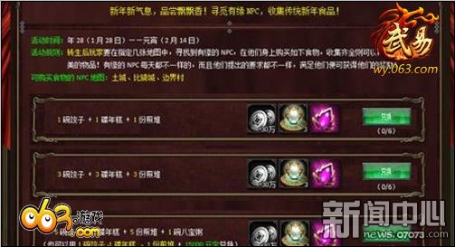 ¡¡¡¡Ã¿·ê´º½ÚÅÖÈý½ï£¬ÏàÐÅÕâ¶ÔÓÚ³Ô»õÀ´Ëµ¸ù±¾²»Ëãʶù£¬µ«¶Ì¶ÌµÄ¼ÙÆÚÔõÄÜÂú×ãºú³Ôº£ºÈµÄ³Ô»õÃÇÄØ£¿ÎªÁËÂú×ã³Ô»õÃÇÒâÓÌδ¾¡µÄÐÄÇ飬¡¶063ÎäÒס·½«Îª´ó¼Ò´øÀ´¸ü¶àÐÂÄ긣Àû£¬¸÷ÖÖÃÀʳÈóԻõÃÇÓû°Õ²»ÄÜ¡£Íæ¼ÒÖ»ÒªÔÚ¡¶063ÎäÒס·µÄÈýÕŵØÍ¼ÖУ¬ÏµÍ³Ã¿Ì콫»áËæÒâÔÚ4¸öNPCÉíÉÏË¢³ö¹ºÂòʳ²ÄµÄ½Å²½°´Å¥£¬Íæ¼ÒÃÇÖ»Ðè°´ÕսŲ½µÄÌáʾÊÕ¼¯µ½½È×Ó£¬Äê¸â£¬¼å¶ÑºÍ°Ë±¦ÖàÖ®ÀàµÄʳ²Ä¾Í¿É¶Ò»»¸÷ÖÖ½±Æ·¡£ÃÀʳ¾ÍÔÚÕâÀ³Ô»õÃÇ×¼±¸ºÃÁËÂð£¿