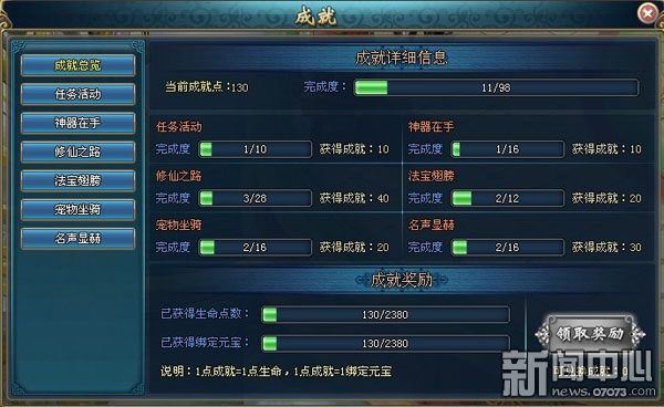 ¡¡¡¡Íæ¼Òµã¿ª´óÖíÍø¡¶ÓùÌì¡·³É¾Íϵͳ£¬¾Í¿ÉÒÔ¿´µ½Ò»¸ö³É¾Í×ÜÀÀ£¬ÀïÃæ¼ÇÔØ×ÅÄãµÄ¸÷ÖÖÍê³ÉÓëδÍê³ÉµÄ³É¾Í¡£ÈÎÎñ»î¶¯¡¢ÉñÆ÷ÔÚÊÖ¡¢ÐÞÏÉ֮·¡¢·¨±¦³á°ò¡¢³èÎï×øÆï¡¢ÃûÉùÏÔºÕÁù´ó³É¾ÍÍê³É¶È¶¼»áÇå³þµÄÏÔʾÔڳɾÍ×ÜÀÀÖС£