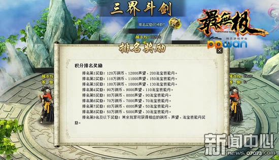 ¡¡¡¡Èý½ç¶·½£·ÖΪÈý¸ö½×¶Î£¬¼´»ý·ÖÈü¡¢ÌÔÌÈüºÍ×ܾöÈü¡£¶·½£Ç°ÈýÌìΪ»ý·ÖÈü£¬ÔÚ»ý·ÖÈüÆÚ¼ä£¬·ÖΪA¡¢B¡¢C¡¢D¡¢E¡¢F¡¢G¡¢H°Ë¸öС×éͬʱ½øÐÐPK£¬Ã¿Ìì0µã¡¢6µã¡¢12µã¡¢18µã£¬ÏµÍ³»áÃâ·ÑË¢ÐÂÎåλʵÁ¦Í¬µÈµÄ¶ÔÊÖÔÚ¶·½£Õ½³¡£¬Íæ¼Ò¿ÉÒÔ×ÔÓÉÑ¡Ôñ£¬Ã¿ÈÕ¿ÉÒÔÃâ·ÑÌôÕ½10´Î£¬µ±Îåλ¶ÔÊÖÈ«²¿ÌôÕ½¹ýºó£¬»¨·ÑÒ»¶¨Ôª±¦¿ÉÒÔÁ¢¼´Ë¢Ð¡£»ý·ÖÈü²»ÂÛÊäÓ®¶¼Äܹ»»ñµÃ»ý·Ö£¬Ê¤Àû»ñµÃ20µã»ý·Ö£¬Ê§°Ü»ñµÃ3»ý·Ö,ͬʱ»¹ÓÐÏàÓ¦½±Àø¡£Ã¿Ìì¿ÉÒÔÁìȡһ´Î»ý·ÖÅÅÃû½±Àø£¬ÅÅÃûÔ½¸ß½±Àø¸ü¼Ó·áºñ¡£ÒòΪºóÐøÌÔÌÈüÈ¡»ý·ÖÈüµÄǰ°ËÃû£¬ËùÒÔÍæ¼ÒÒ»¶¨ÒªÔÚ×öºÃÁËÍòȫ׼±¸Ö®Ê±£¬À´Ó½ÓÐÂÒ»ÂÖµÄÌôÕ½¡£