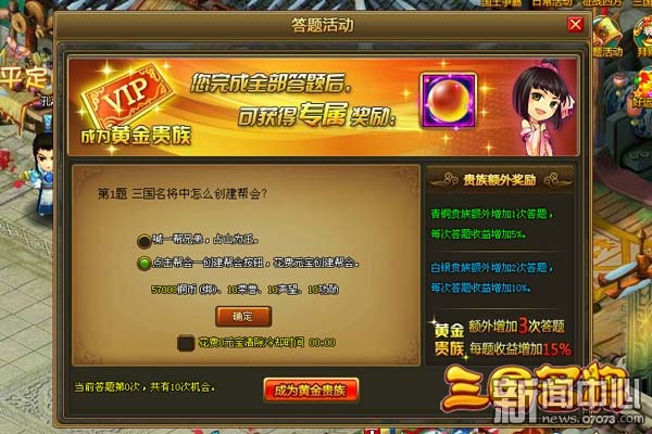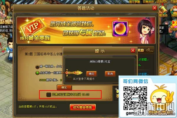 ¡¡¡¡ÁíÍ⣬¡¶Èý¹úÃû½«¡·Íæ¼Òÿ´ð¶ÔÒ»µÀÌ⣬¶¼Òª¾¹ýÒ»¶Îʱ¼äµÄÀäÈ´CDʱ¼ä£¬·½ÄÜÔٴδðÌâ¡£Èç¹ûÄãÏë»Ø´ð¸ü¶àµÄÌâÄ¿£¬ÒÔ±ã»ñµÃ¸ü¶àµÄ½±ÀøµÄ»°£¬ÄÇôÄãÓÐÁ½ÖÖ·½Ê½£¬Ò»ÊÇ»¨·ÑÉÙÁ¿Ôª±¦Çå³ýÎÊÌâCD£¬¶þÊdzÉΪ»Æ½ð¹ó×å»ñµÃרÊô´ðÌâ½±Àø¡£µ«ÊÇ£¬Èç¹ûÄã¼á³ÖÒÔ·ÇRÍæ¼ÒµÄÉí·ÝÍæÓÎÏ·µÄ»°£¬ÄÇôС±à½¨ÒéÄ㻹ÊÇĬĬµÈ´ý´ðÌâÀäÈ´CDʱ¼ä°É£¡