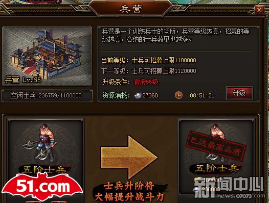 ¡¡¡¡"±øÓª"µ±Ö÷¹«µÈ¼¶´ïµ½11¼¶µÄʱºò¿ª·Å,ÌáÉý±øÓªµÄµÈ¼¶£¬¿ÉÒÔ½âËø¸ü¸ß¼¶µÄÊ¿±ø¡£Ê¿±øÃ¿ÌáÉýÒ»½×£¬Õ½¶·Á¦¶¼ÊÇ·±¶µÄÔö³¤¡£ÕÐļʿ±øÖ»ÐèÒªÏûºÄÉÙÁ¿µÄÁ¸²Ý£¬ÔÚ¡¶Èý¹ú»ê¡·ÀÕÐļʿ±øÊDz»ÐèÒªµÈ´ýµÄ£¬ÕÐļºóÖ±½Ó¾Í¿ÉÒÔ×Ô¶¯µÄÅäÖõ½ÏàÓ¦µÄÎ佫ÉÏ¡£