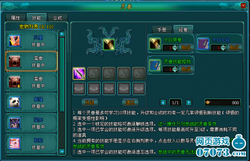 初始技能:每个宠物都拥有各自独特的技能,并且在升级或合成的时候还有一定几率(取决于悟性的高低)领悟到新的技能