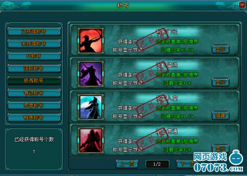 修炼称号:修炼称号是衡量角色修真境界的依据,该称号能为角色带来闪避加成
