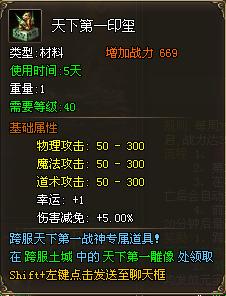 ¡¡¡¡1¡¢»ñµÃ¶ÀÒ»ÎÞ¶þµÄÕ½ÉñÓ¡çôÕ£¬ÊôÐÔ¼«¸ß¡£Ö»ÓÐÌìϵÚÒ»Õ½Éñ¿ÉÒÔÅå´÷¡£