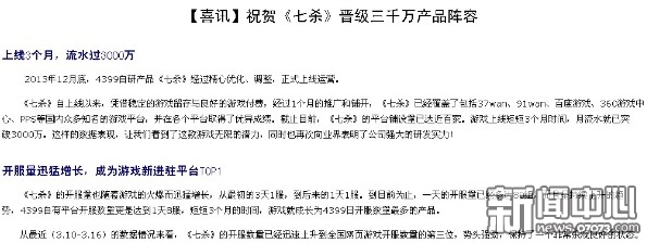 ¡¡¡¡ÔÚÒ³ÓνçÓÐÒ»¸ö¾¾Ã²»Ë¥µÄÌâ²Ä£º´«Ææ¡£È¥Äê5¿î´«ÆæÀàÓÎÏ·°ÔÕ¼Ò³ÓÎÁ÷Ë®°ñǰ10Ãû£¬Èç´ËÊ¢¿ö¾ÍÁ¬Ò»ÏòÒÔÏÉÏÀRPGΪÖ÷µÄ4399Ò²¿ªÊ¼³¢ÊÔ´ËÀàÌâ²Ä£¬ÍƳöÁËËûÃǵÄ×ÔÑвúÆ·¡¶Æßɱ¡·¡£¸ù¾Ý×òÌì´Ó4399ÄÚ²¿ÆØ¹âµÄÒ»·âÓʼþÀ´¿´£¬¸ÃÓÎÏ·µÄÁ÷Ë®ÒѾ´òÆÆÁË3000Íò´ó¹Ø¡£