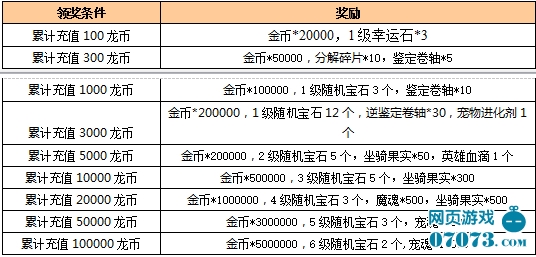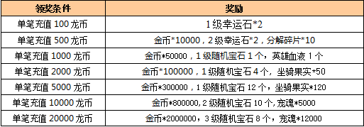 ¡¡¡¡»î¶¯ÃèÊö£ºÎªÇìףзþ»ð±¬¿ªÆô£¬¿ª·þÒ»ÖÜÄÚ£¬Íæ¼Òÿ´Î³äÖµ¿É°´ÕÕµ¥±Ê³äÖµÊý¶î£¬»ñÈ¡ÏàÓ¦µÄ³¬ÖµµÀ¾ß£¬½±ÀøÄÚÈÝÈçÏ£º