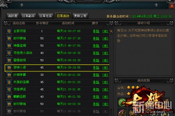 ¡¡¡¡¡¶Æßɱ¡·“аÉñÈëÇÖ”¸±±¾ÔÚÿÌìµÄ19:35-19:55Õâ¸öʱ¼ä¶ÎÄÚ¿ªÆô£¬»î¶¯³¡µØÊÇÔÚÆßɱÓÎÏ·µÄɳ³Ç£¬Íæ¼ÒµÈ¼¶´ïµ½45¼¶¾Í¿ÉÒÔËæÒâ½øÈëÌôÕ½¡£½ìʱ£¬´óboss²»ËÀаÉñ»á´øÁìÒ»´ó°ïС¹ÖºÍbossÏ®À´£¬Ö»Òª½«ËüÃÇ»÷ɱ£¬¾ÍÓÐÒ»¶¨µÄ¼¸Âʱ¬³ö×î¸ß¼¶µÄ×ÏÉ«ÖÁ×ðÌ××°£¬ÒÔ¼°¸÷Öָ߼¶ºÚË®¾§¡£