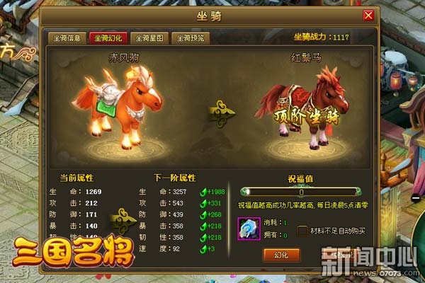¡¡¡¡Íæ¼Ò¿ÉÒÔͨ¹ýÏûºÄ×øÆï»Ã»¯²ÄÁϵķ½Ê½»Ã»¯³ö¸üΪ¸ß¼¶µÄ×øÆï¡£ÐèҪעÒâµÄÊÇ£¬ÄãµÄÿ´Î»Ã»¯¶¼»áÔö¼Ó×£¸£Öµ£¬×£¸£Öµ´ïµ½ÉÏÏÞºó¾ø¶Ô»á³É¹¦¡£ÁíÍ⣬ÿÌìÁ賿5µã×£¸£Öµ»áÇåÁã¡£ÒÔÏÂÊÇ×øÆï»Ã»¯ËùÐè²ÄÁϵÄÏà¹ØÊýÖµ£¬´ó¼Ò¿É½è¼ø²Î¿¼¡£