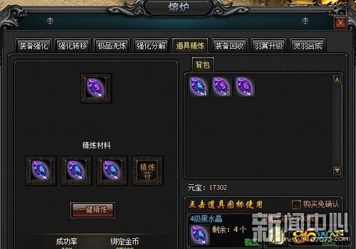 第四:黑水晶精炼还要花费一定量的绑定金币,但一般来说都是很少的。如果你绑定金币不够,可以先去做金币任务,又或者把一些装备回收掉吧。