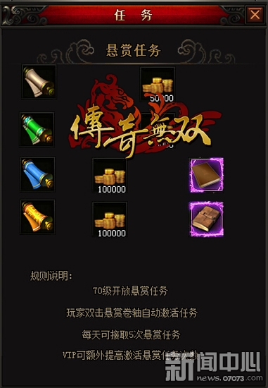 ¡¡¡¡´ïµ½70¼¶µÄÍæ¼Ò£¬Ã¿Ìì¿ÉÒÔǰÍùÖ÷³ÇÈÎÎñ´óʹ´¦£¬Ê¹ÓÃÉíÉÏͨ¹ý´ò¹Ö¡¢Ðлá»ý·ÖµÈ·½Ê½µÃµ½µÄ°×¡¢ÂÌ¡¢À¶¡¢½ðËÄ´óÐüÉ;íÖáÖ®Ò»£¬ÁìÈ¡5´ÎÐüÉÍÈÎÎñ£¬²¢°´ÕÕÈÎÎñÌáʾÖð²½Íê³É£¬×îÖÕ»ñµÃ·áºñ½±Àø¡£¶øÇÒÈç¹û³ÉΪVIP£¬Íæ¼Ò»¹ÄܶîÍâÌá¸ßÐüÉÍÈÎÎñ´ÎÊý£¬ÊÕ»ñ¸ü¶àµÄ½ð±ÒºÍÄÚ¹¦Êé½±Àø¡£